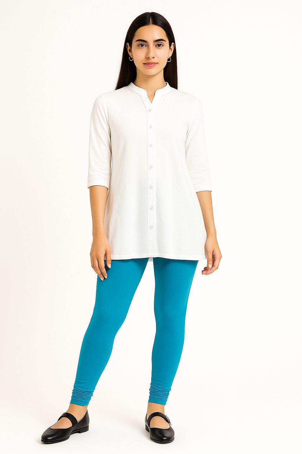 The Aqua blue colour shade pairs beautifully with whites, blacks, beige, floral tops, and ethnic tops . Designed to move with you, these leggings stay in shape even after multiple washes. Whether you’re dressing up for a casual outing or styling for traditional events, these leggings bring confidence and charm to your look.