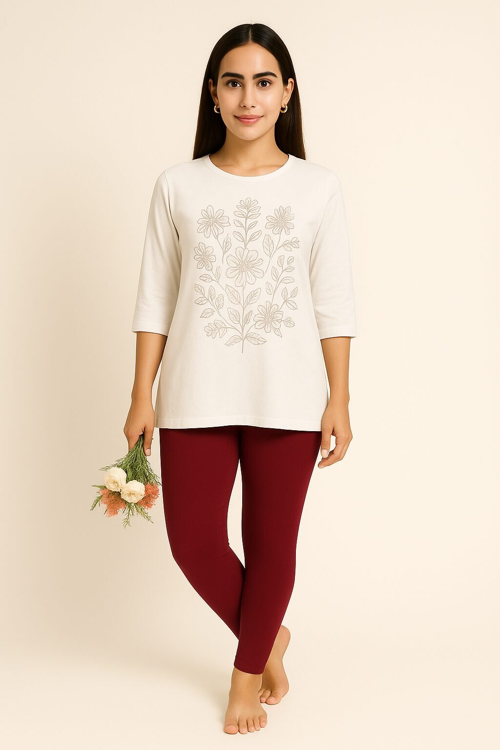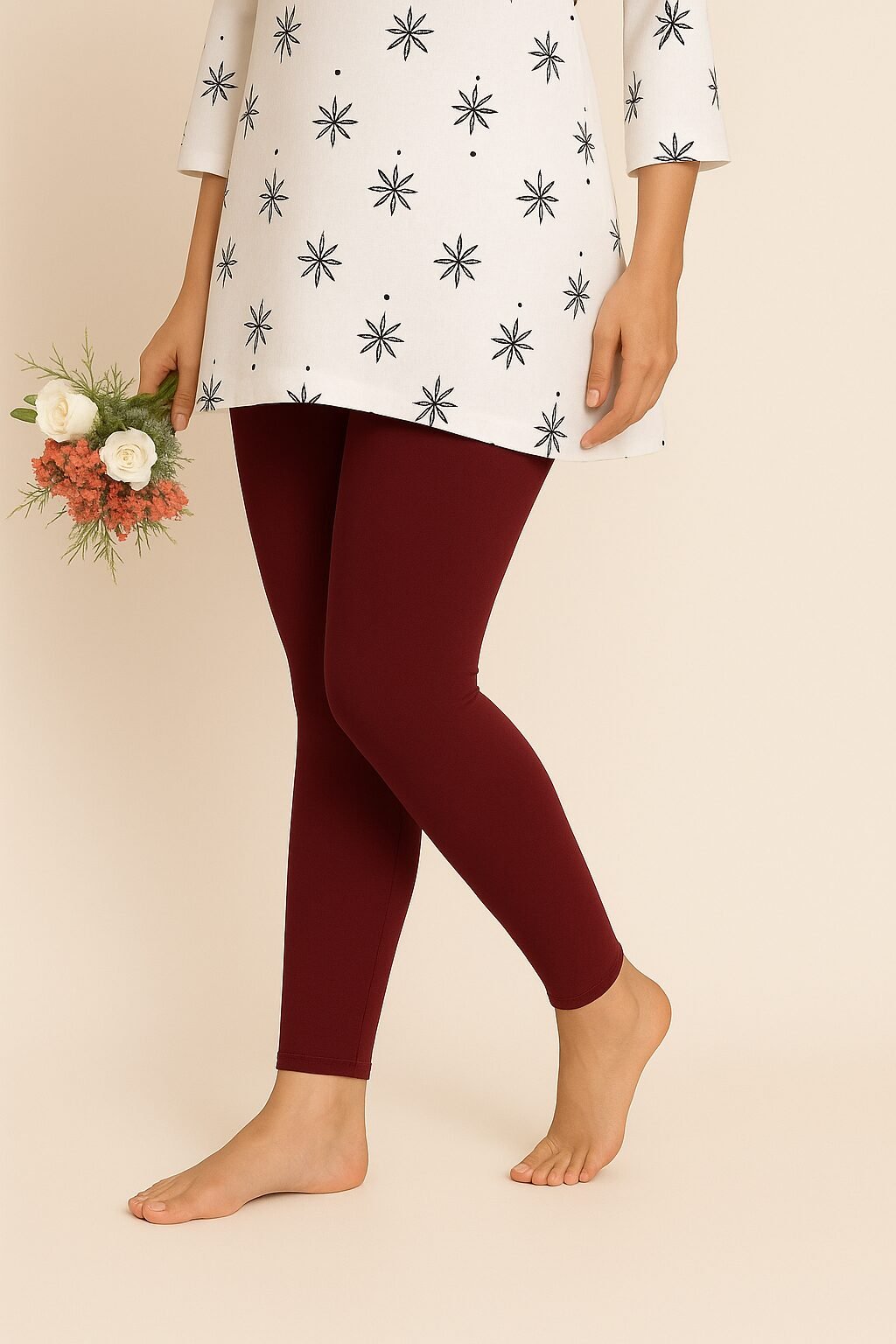 The deep maroon Ankle colour shade pairs beautifully with whites, blacks, beige, floral tops, and ethnic tops . Designed to move with you, these leggings stay in shape even after multiple washes. Whether you’re dressing up for a casual outing or styling for traditional events, these leggings bring confidence and charm to your look.