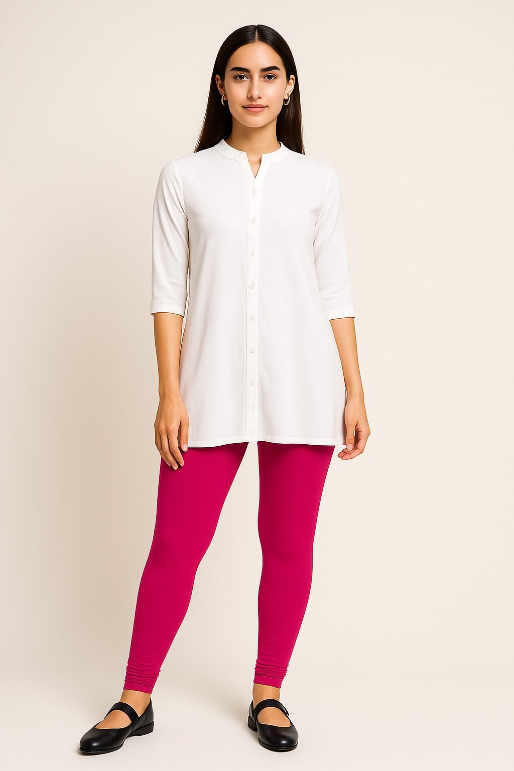 The hot pink colour shade pairs beautifully with whites, blacks, beige, floral tops, and ethnic tops . Designed to move with you, these leggings stay in shape even after multiple washes. Whether you’re dressing up for a casual outing or styling for traditional events, these leggings bring confidence and charm to your look.