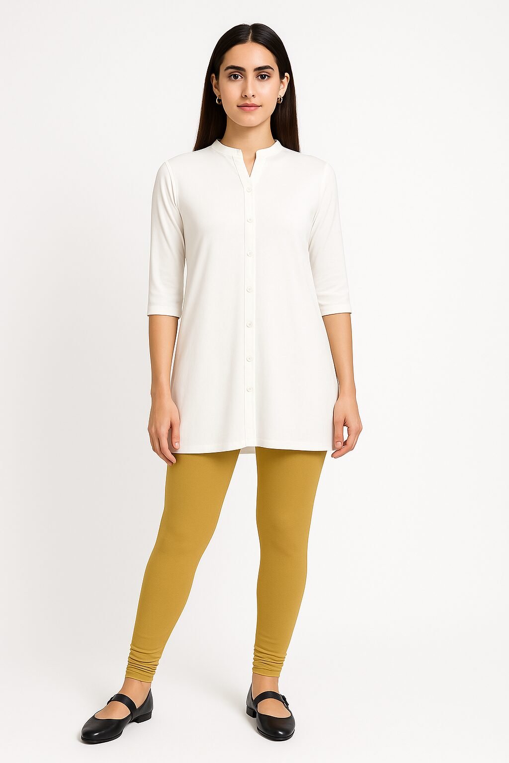 The khaki colour shade pairs beautifully with whites, blacks, beige, floral tops, and ethnic tops . Designed to move with you, these leggings stay in shape even after multiple washes. Whether you’re dressing up for a casual outing or styling for traditional events, these leggings bring confidence and charm to your look.