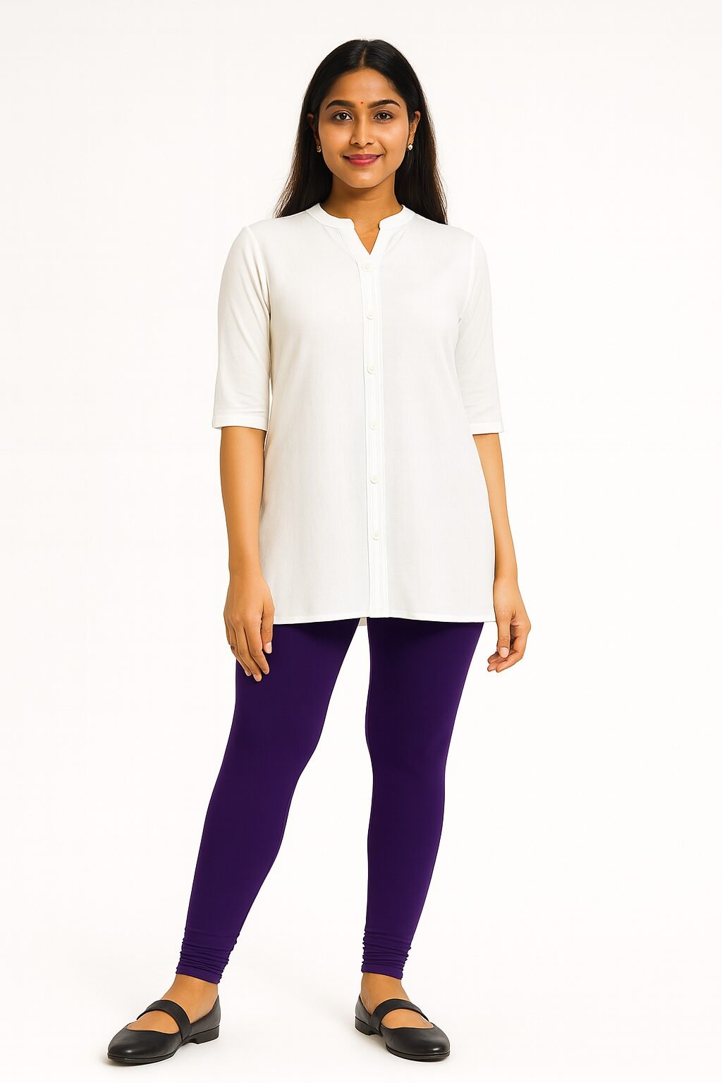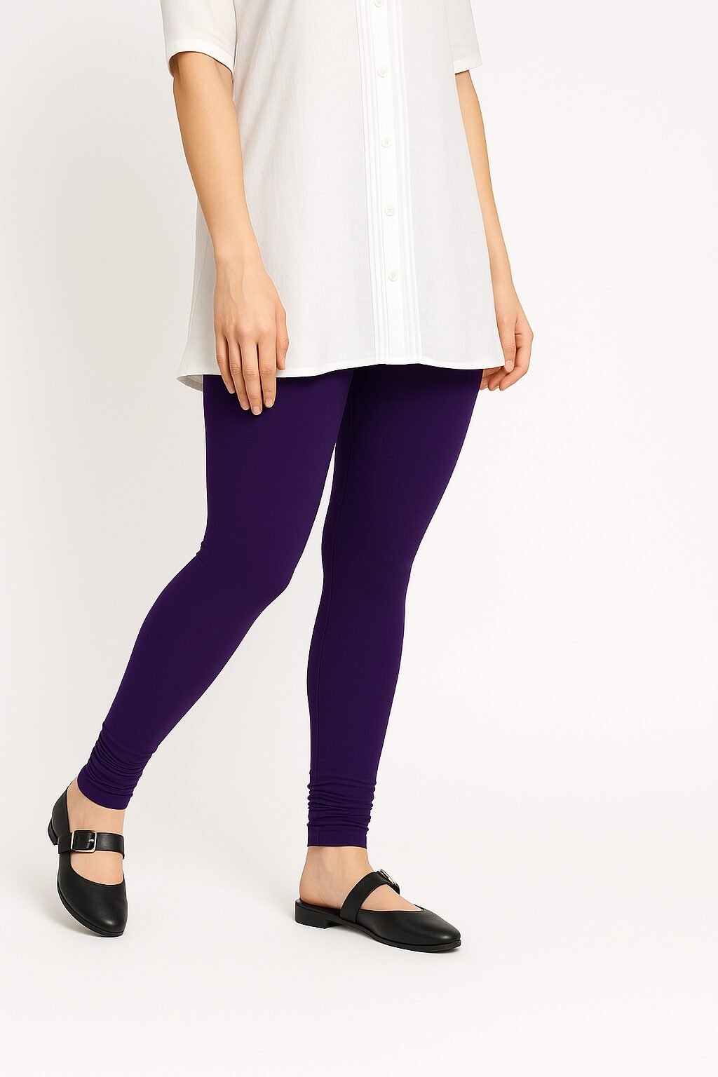 The Royal purple colour shade pairs beautifully with whites, blacks, beige, floral tops, and ethnic tops . Designed to move with you, these leggings stay in shape even after multiple washes. Whether you’re dressing up for a casual outing or styling for traditional events, these leggings bring confidence and charm to your look.