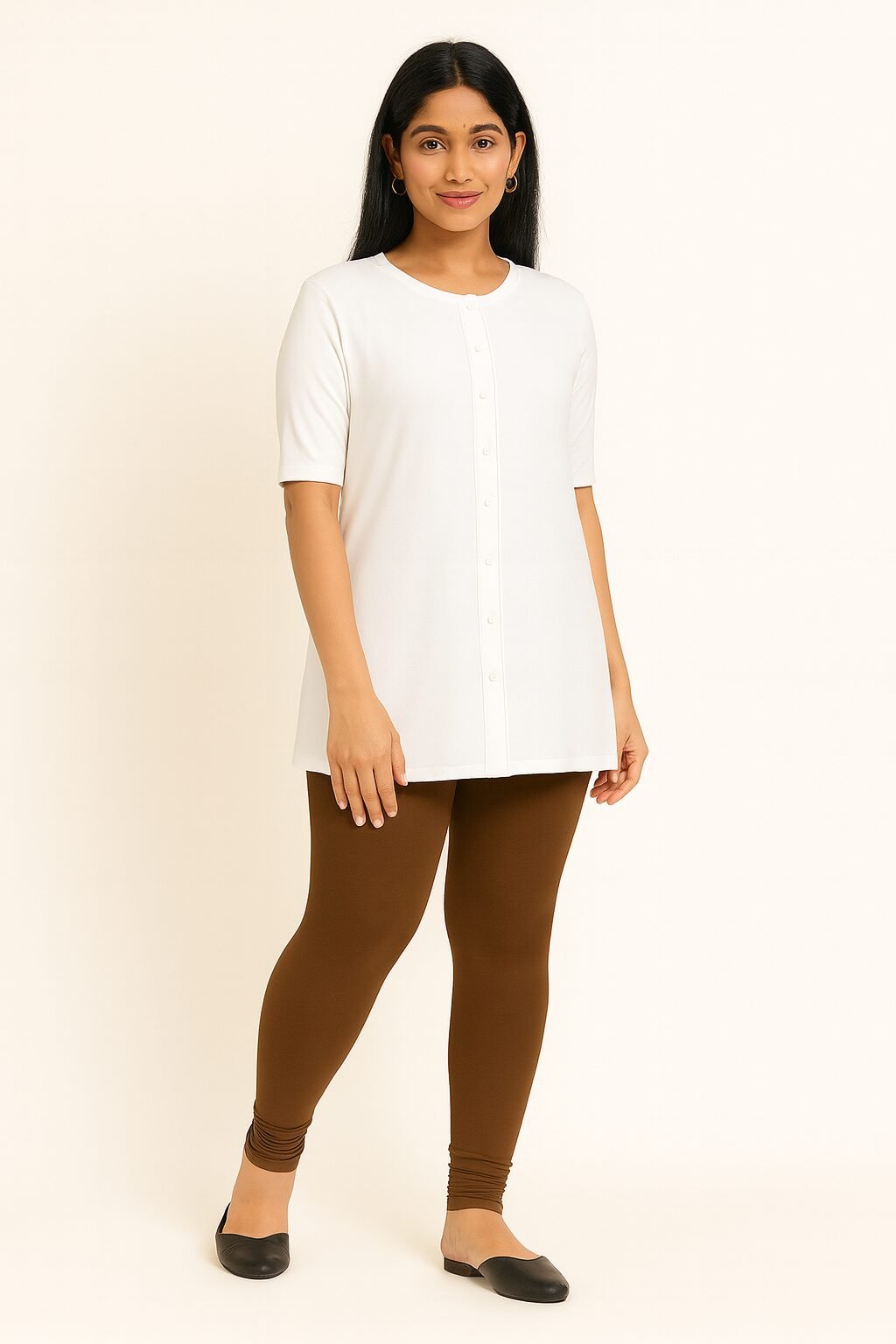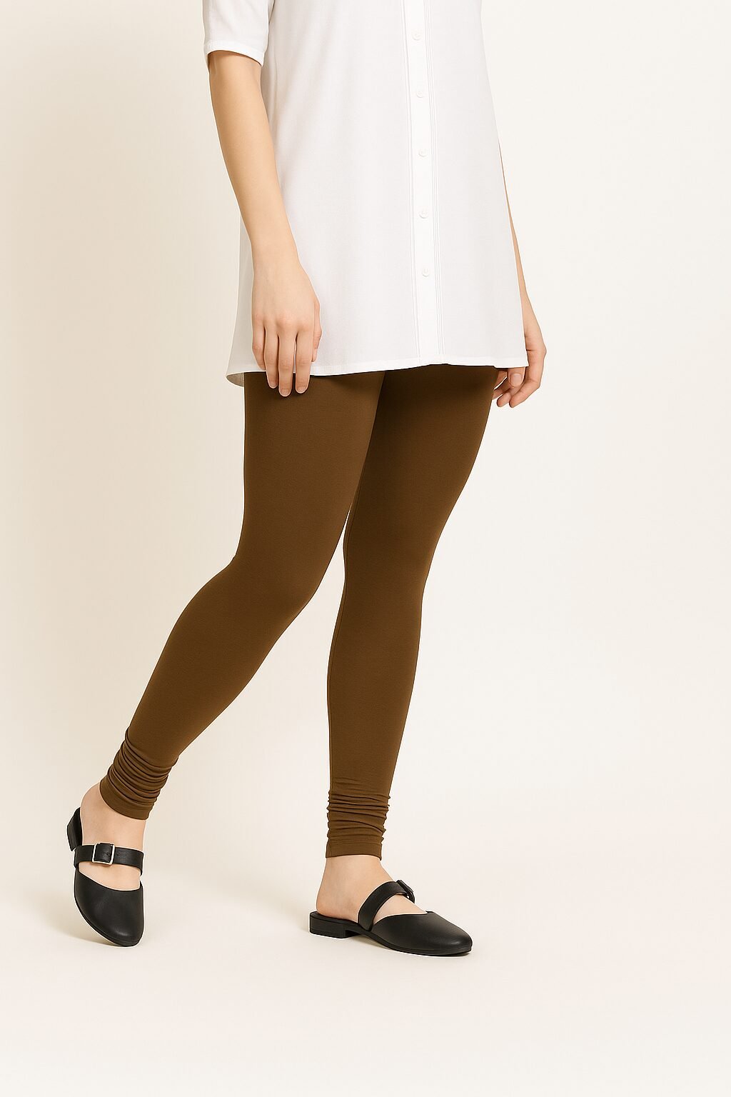 The walnut brown colour shade pairs beautifully with whites, blacks, beige, floral tops, and ethnic tops . Designed to move with you, these leggings stay in shape even after multiple washes. Whether you’re dressing up for a casual outing or styling for traditional events, these leggings bring confidence and charm to your look.